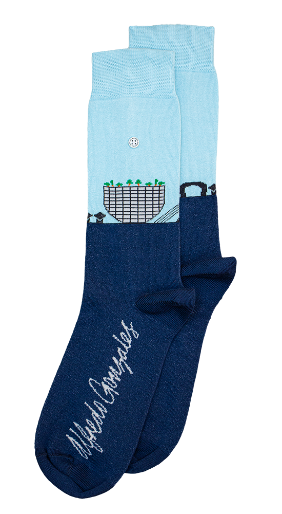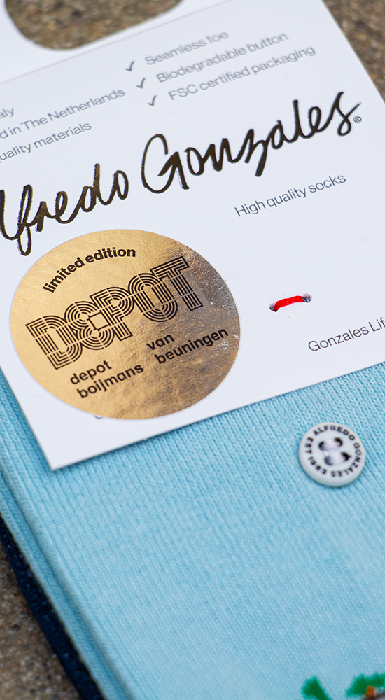 The limited-edition Depot x Alfredo Gonzales sock is here. Developed specially in honour of Depot Boijmans Van Beuningen in collaboration with the extravagant and colourful brand from Rotterdam Alfredo Gonzales. The socks are made from high quality cotton, come with the trademark AG button on the side and are produced in Italy. Next to that the sock is available in 1 children size, the perfect gift for child & parent (the latter only available at Depot).